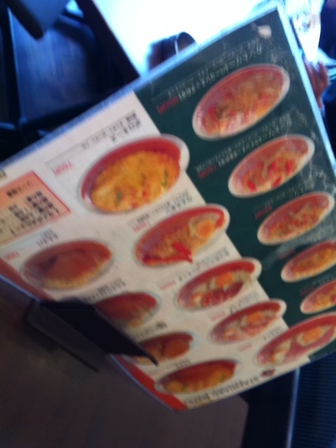 午前11時半入店で、店内には男性客2人。カウンターがガラ空きだったので真っ直ぐ向かおうとすると、「こちらにどうぞ」とテーブルの方へ誘導される。厨房観察したかったのに…。不満が残りつつメニューに目をやる。
