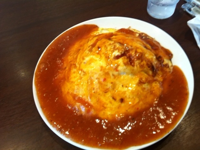 撮りにくい雰囲気なので、写真が悪い。わかりづらいかもしれませんが、相当デカイ。右奥の半分だけ写ってるコップと比べてもらえればなんとかわかるだろうか?顔を覆い隠せるほどのデッカい卵。包みこむようにソースもたっぷりかかっている。ボリュームは事前調査で熟知していたので気になるのは味…。とりあえず卵を切り分け一口放り込む…。